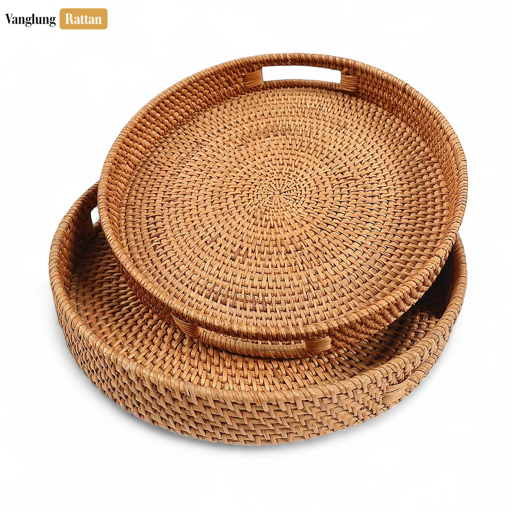Brown Circular Straw Rattan Serving Tray with Integrated Handles – STRO011001BR