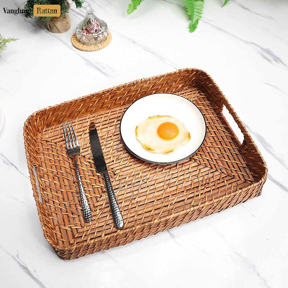 Handwoven Brown Round Rectangle Bamboo Rattan Serving Tray with Integrated Handles – STCN051007S