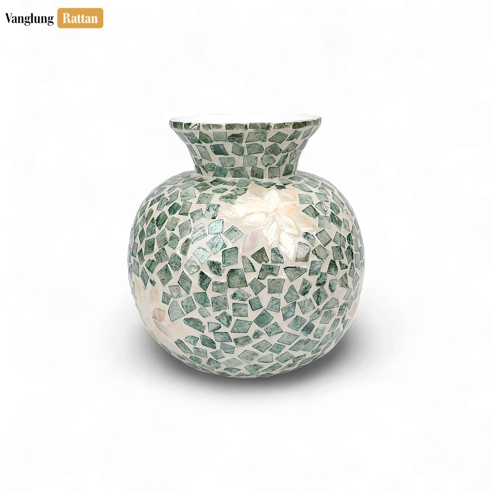 Transform your living space into a coastal paradise with this stunning mother of pearl vase that captures the essence of ocean elegance. The Seafoam Shell Tile Vase with Flower Design brings together the natural beauty of seafoam shell tiles and delicate floral motifs to create a truly exceptional piece of handcrafted home décor.